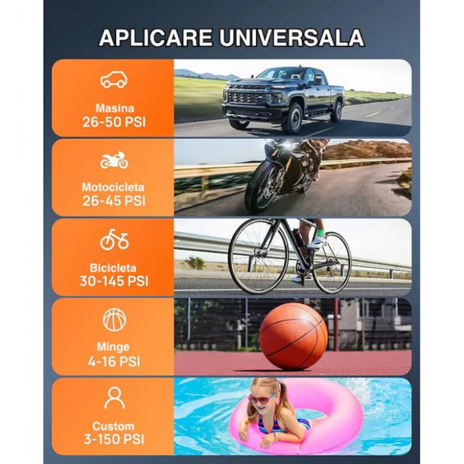 • Versatilitate ridicata: acopera toate nevoile zilnice de umflare, de la anvelope pâna la mingi de sport.