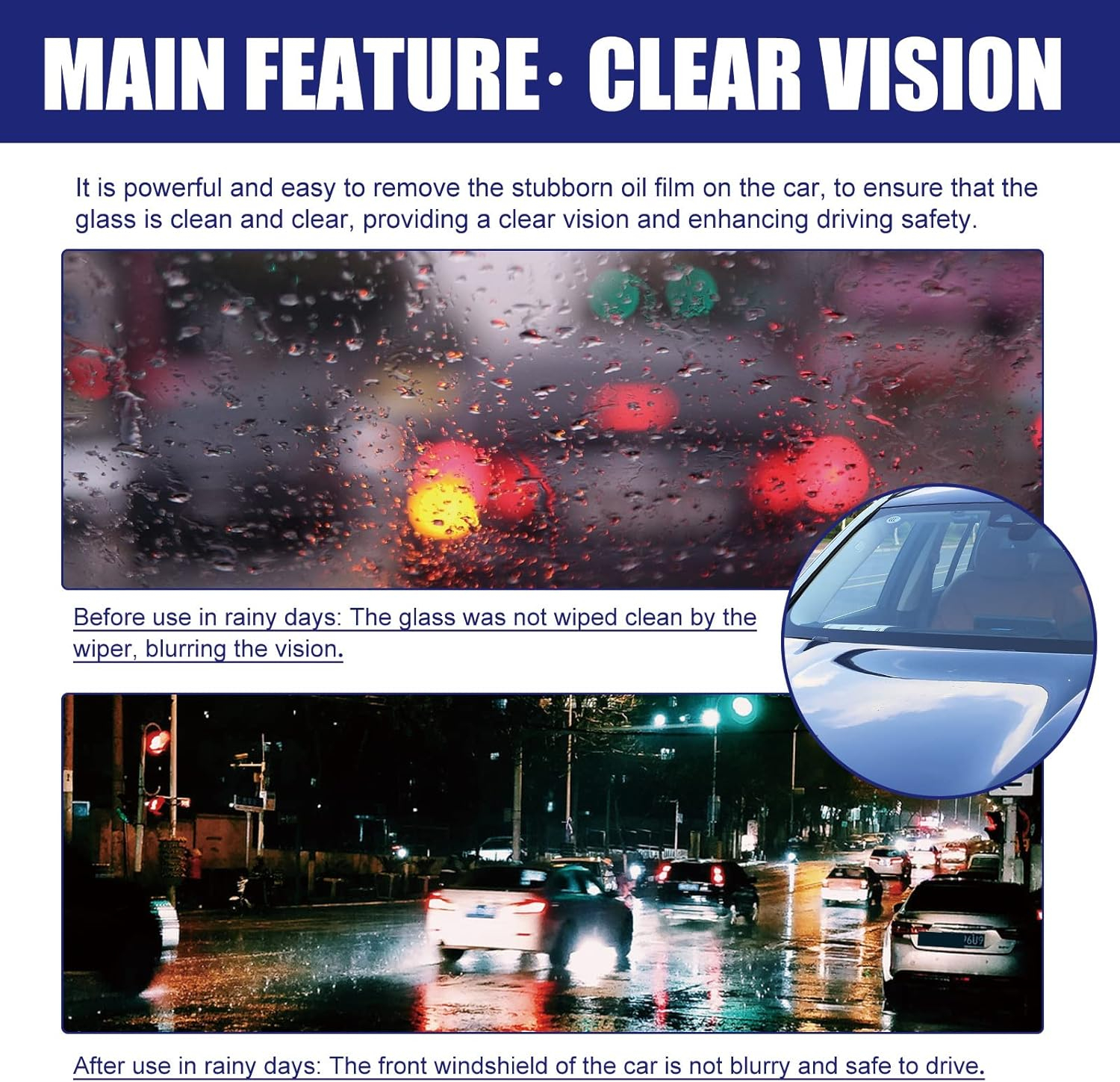 Pe lângă curățare, soluția oferă efect anti-ploaie și anti-aburire, respingând apa și prevenind formarea condensului, pentru o vizibilitate optimă în orice condiții meteo.
