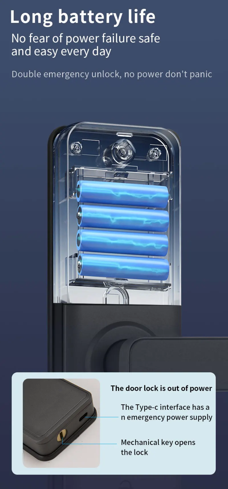 Îmbunătățește securitatea locuinței cu această încuietoare inteligentă WiFi pentru ușă, concepută pentru acces rapid și control modern. Sistemul permite deblocarea ușii prin amprentă biometrică, parolă sau card RFID, oferind mai multe opțiuni de acces în funcție de preferințe.