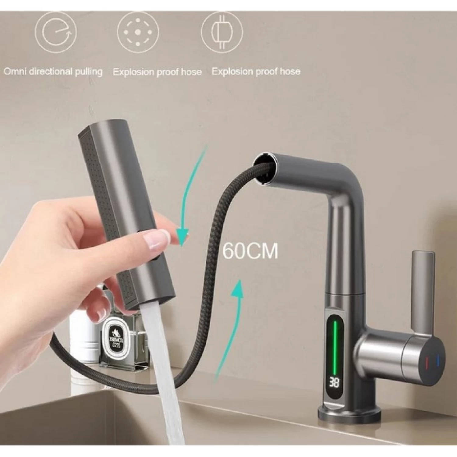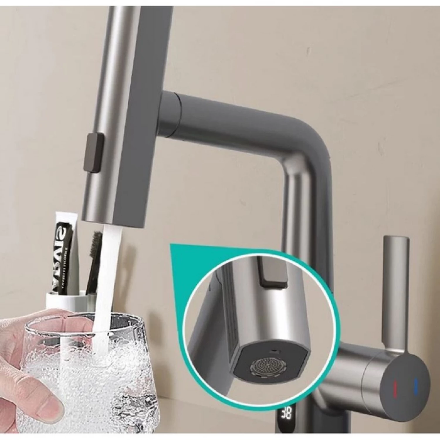 Transforma experienta zilnica din bucatarie sau baie cu aceasta baterie moderna cu dus extractibil si display LED pentru temperatura. Realizata din alama solida de înalta calitate si echipata cu cartus ceramic anti-scurgere, bateria combina designul elegant cu functionalitatea inteligenta, oferind un plus de confort, siguranta si economie de apa.