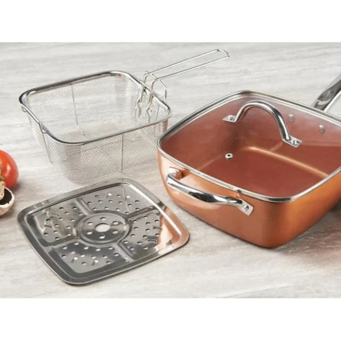 Tigaia multifunctionala patrata este alegerea ideala pentru gatit versatil si eficient, oferind posibilitatea de a prepara rapid o varietate de retete, de la fripturi si legume sotate pana la preparate la cuptor sau prajeli în baie de ulei. Designul adanc si forma patrata permit utilizarea optima a suprafetei de gatire.
