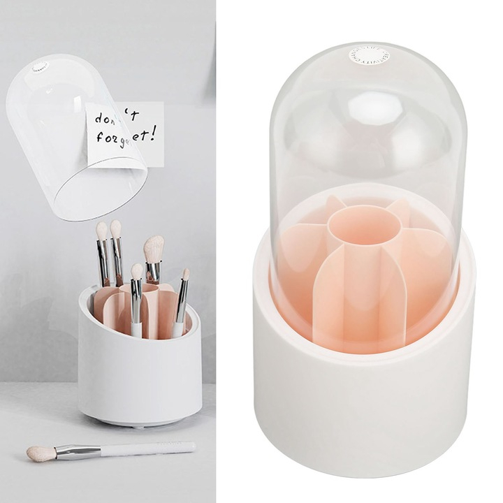 Păstrează-ți pensulele de machiaj organizate și protejate cu acest organizator rotativ 360°, conceput pentru acces rapid și depozitare eficientă. Designul elegant, în culoare albă, se potrivește perfect pe orice masă de machiaj sau birou.