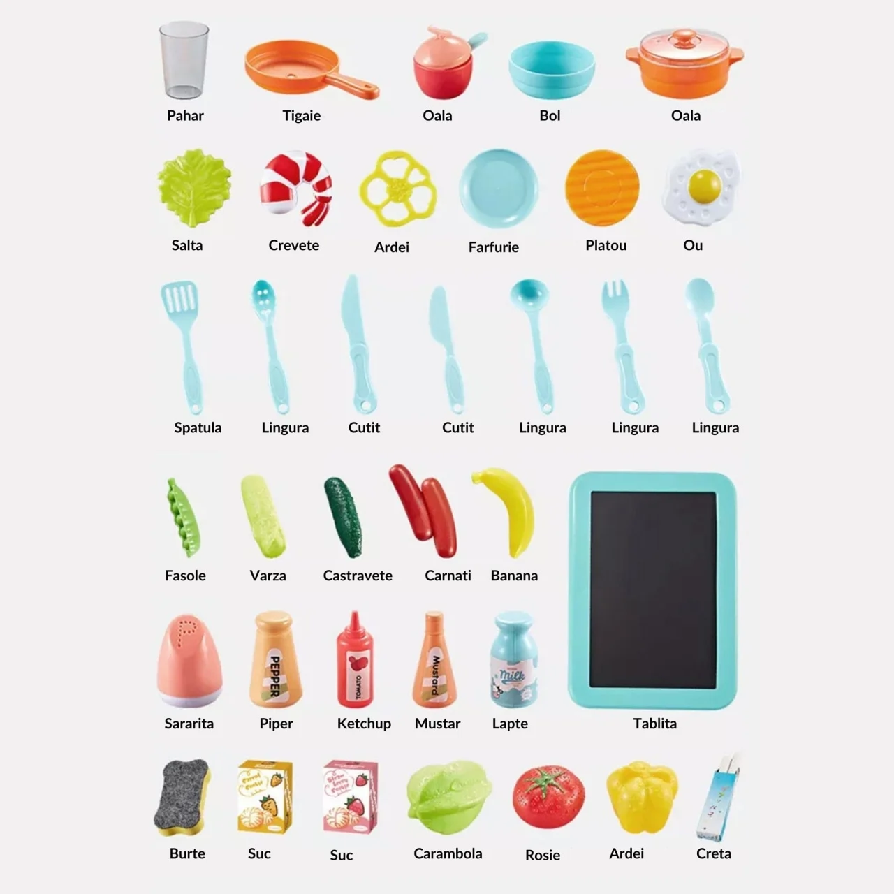 Complex și interactiv, setul de bucătărie pentru copii cu 55 de accesorii oferă o experiență realistă de joacă, contribuind la dezvoltarea creativității și a abilităților sociale.