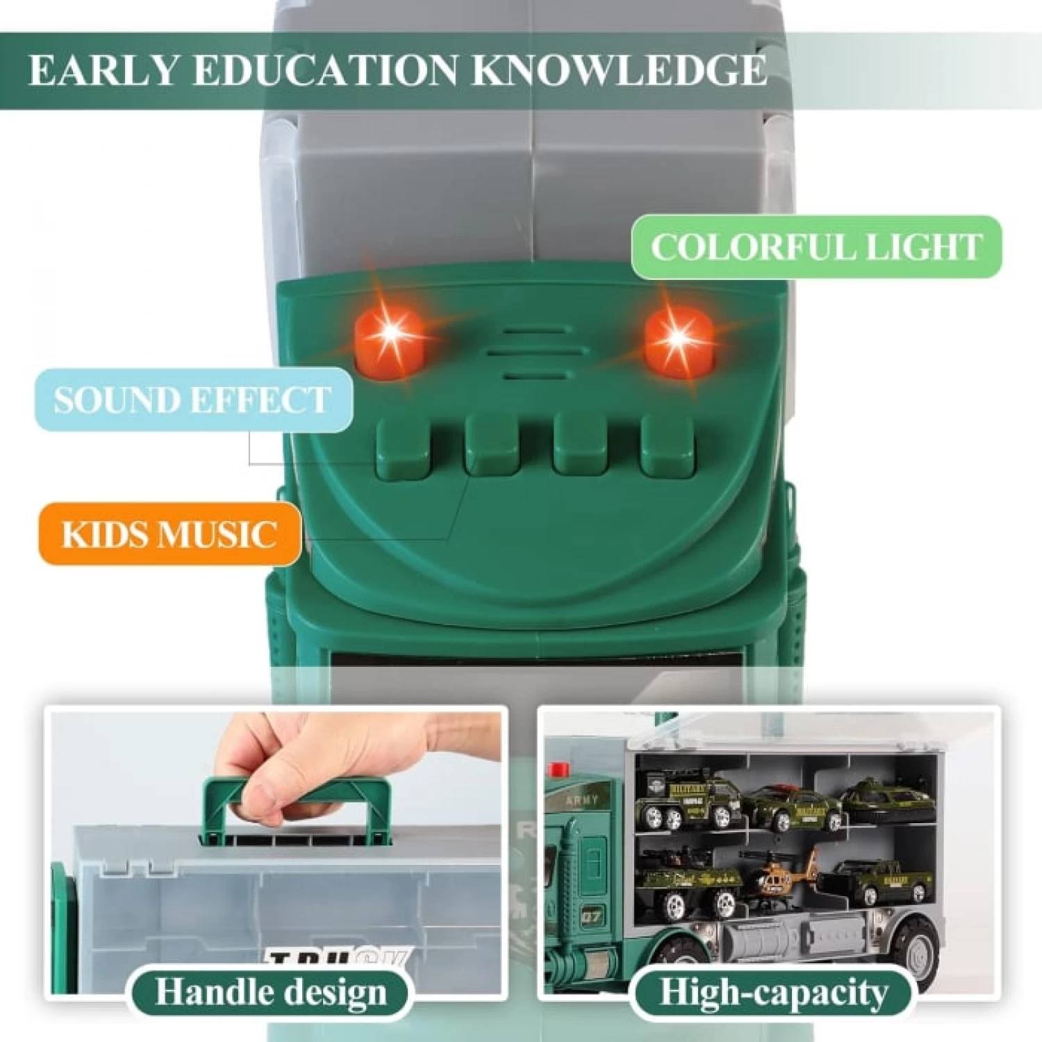 Camionul este dotat cu sunete si lumini realiste pentru o experienta captivanta: cele 4 butoane redau muzica, povesti, poezii si efecte sonore, iar partea superioara se ilumineaza pentru a atrage atentia si a spori realismul jocului.