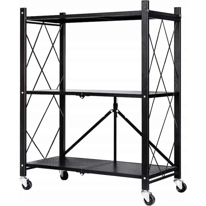 Practic și versatil, raftul metalic pliabil oferă o soluție eficientă pentru organizarea obiectelor, combinând durabilitatea structurii din oțel cu mobilitatea oferită de roțile pivotante.