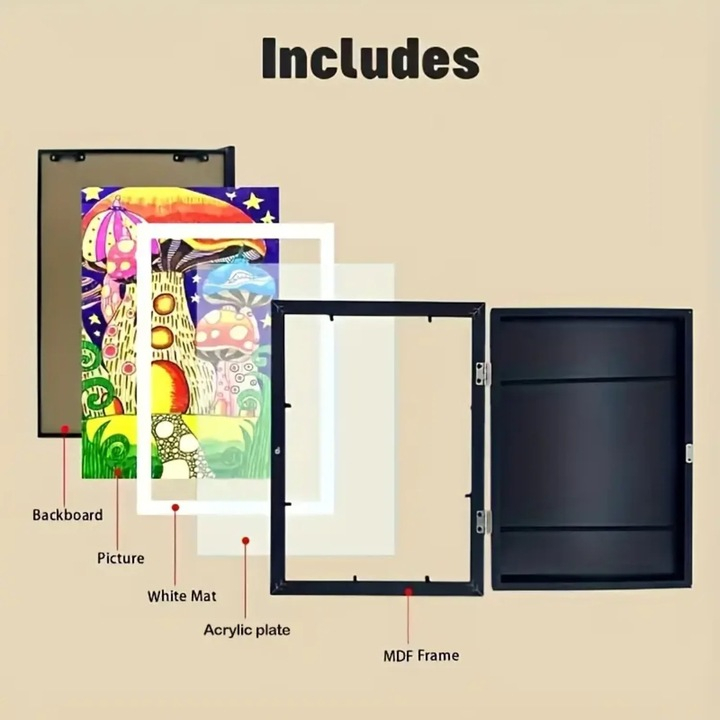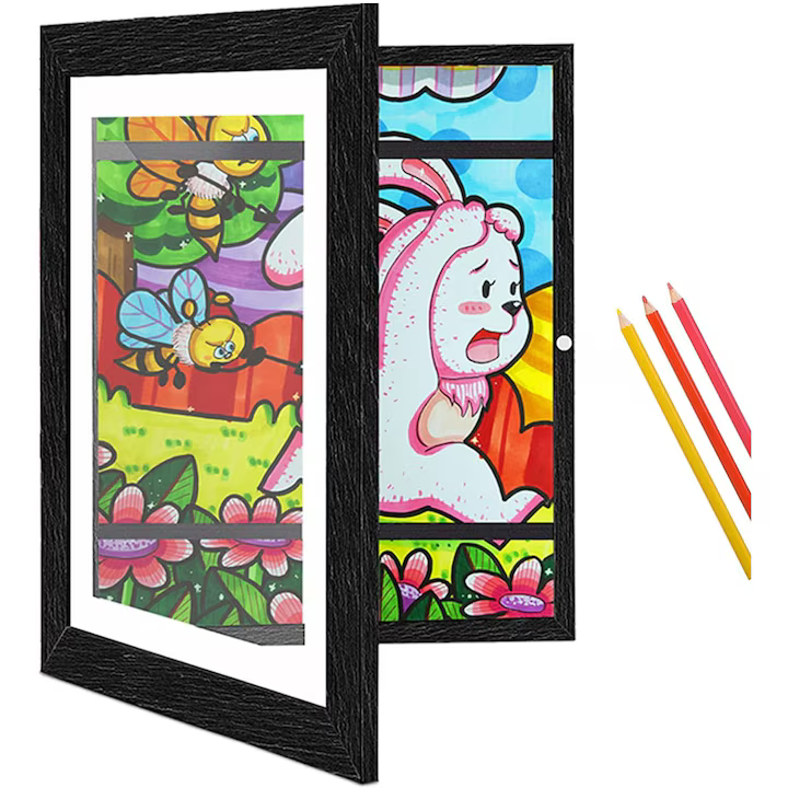 Sistemul de deschidere ușoară permite înlocuirea rapidă a lucrărilor, fără a scoate rama de pe perete. Designul decorativ se potrivește în camera copiilor, living sau spații educaționale, oferind un mod organizat și atractiv de expunere.